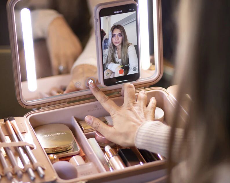 An elegant and practical make-up case, with illuminated mirror, modular storage and long-lasting battery for perfect beauty anywhere, anytime.